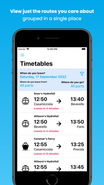 このアプリの特徴の1つは、ナポリ湾で運行しているすべての会社のスケジュールを1つのコンテナにグループ化できることです。これには、Alilauro、Caremar、Gestour、Ippocampo、Laziomar、Medmar、NLG、Scotto Line、SNAVなどの会社が含まれます。ユーザーはルートをフィルタリングして必要な情報のみを表示することもできます。